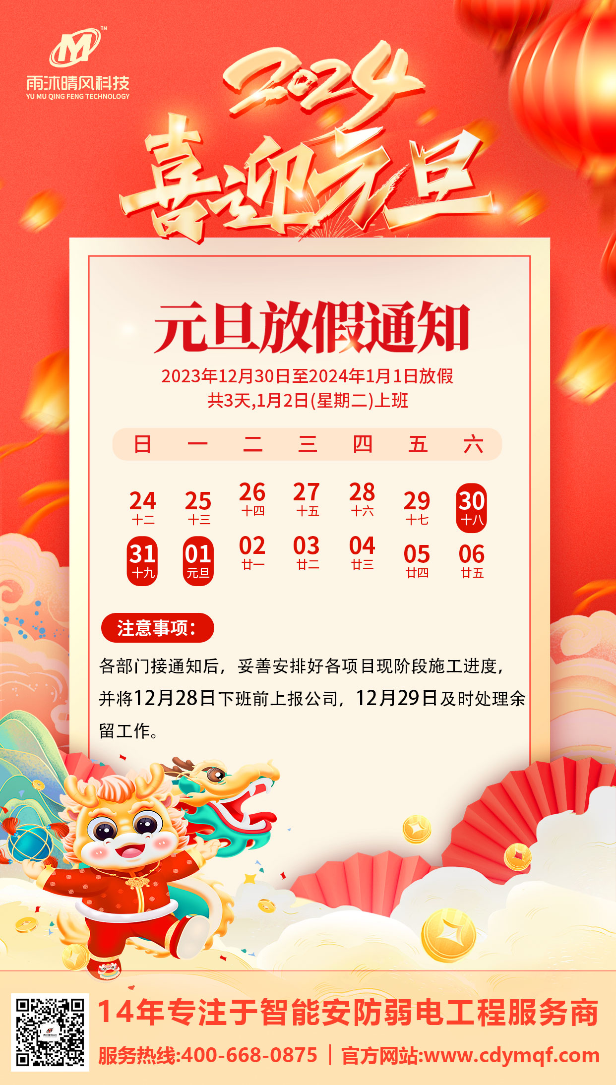 成都弱電公司雨沐晴風(fēng)科技2024年元旦節(jié)放假通知