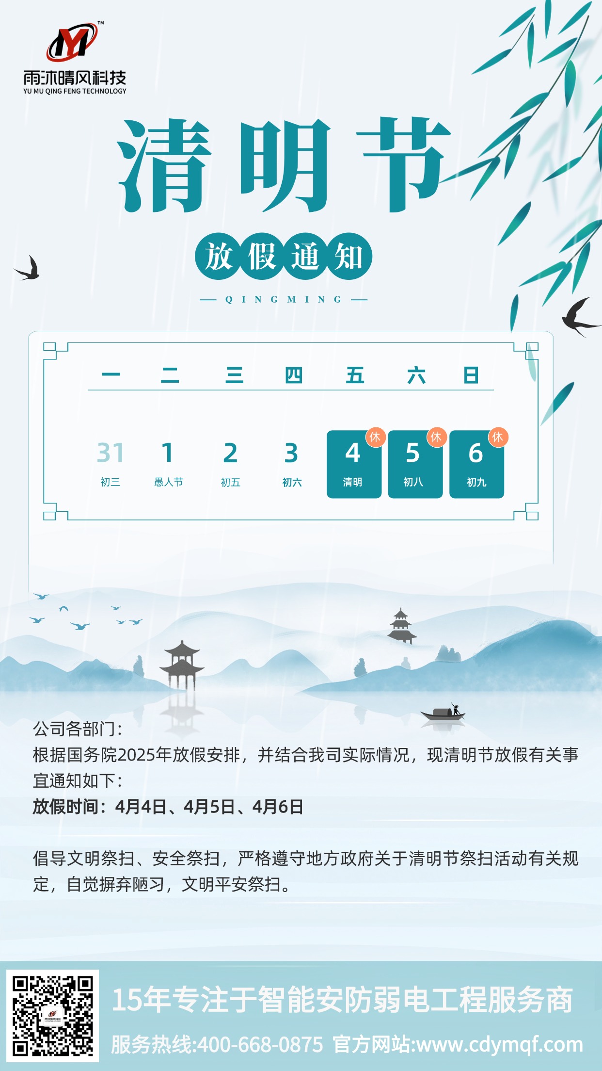 清明節(jié),又稱踏青節(jié)、行清節(jié)、三月節(jié)、祭祖節(jié)等,在每年4月4日至6日之間,是祭祀、祭祖和掃墓的節(jié)日。清明節(jié)源自上古時(shí)代的祖先信仰與春祭禮俗,兼具自然與人文兩大內(nèi)涵,既是自然節(jié)氣點(diǎn),也是傳統(tǒng)節(jié)日。